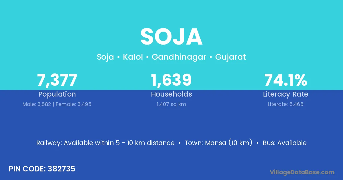 Soja village has a total population of 7,377 people, of which 3,882 are males and 3,495 are females.