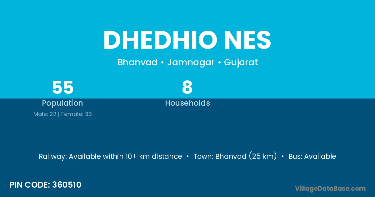 Bhanvad (25 km) is the nearest town to Dhedhio Nes village for major economic activities and is located approximately 25 km away.