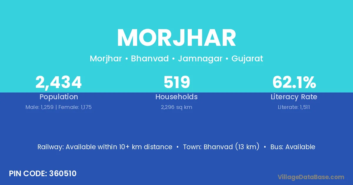 Bhanvad (13 km) is the nearest town to Morjhar village for major economic activities and is located approximately 13 km away.