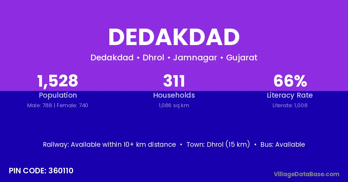 Dhrol (15 km) is the nearest town to Dedakdad village for major economic activities and is located approximately 15 km away.