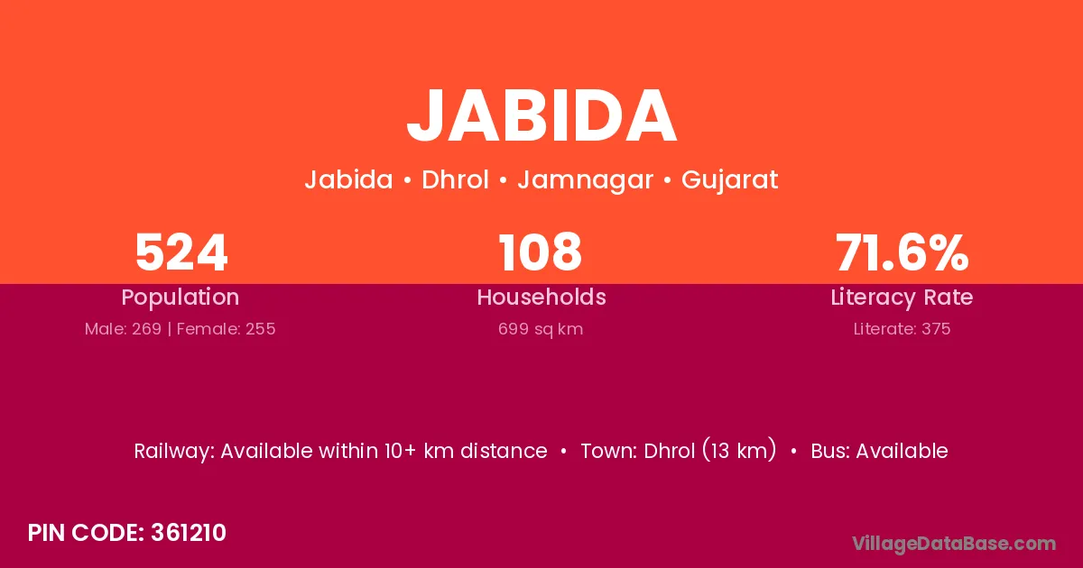 Dhrol (13 km) is the nearest town to Jabida village for major economic activities and is located approximately 13 km away.