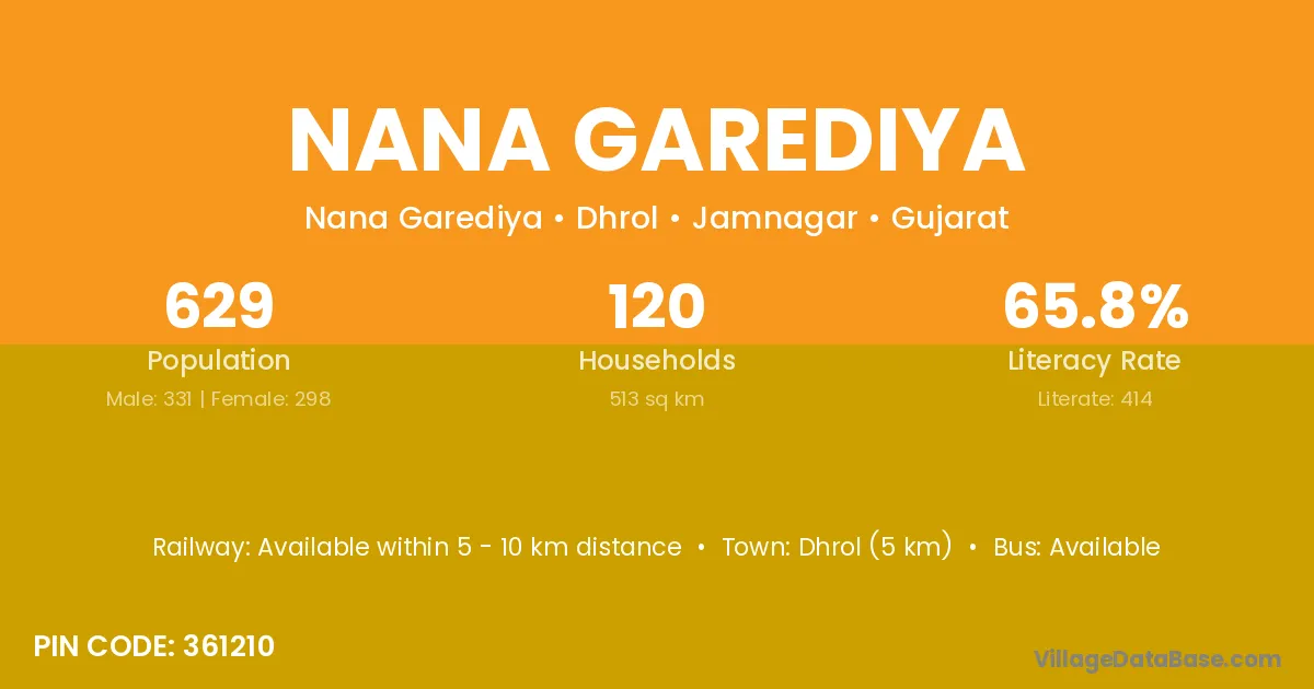 Dhrol (5 km) is the nearest town to Nana Garediya village for major economic activities and is located approximately 5 km away.