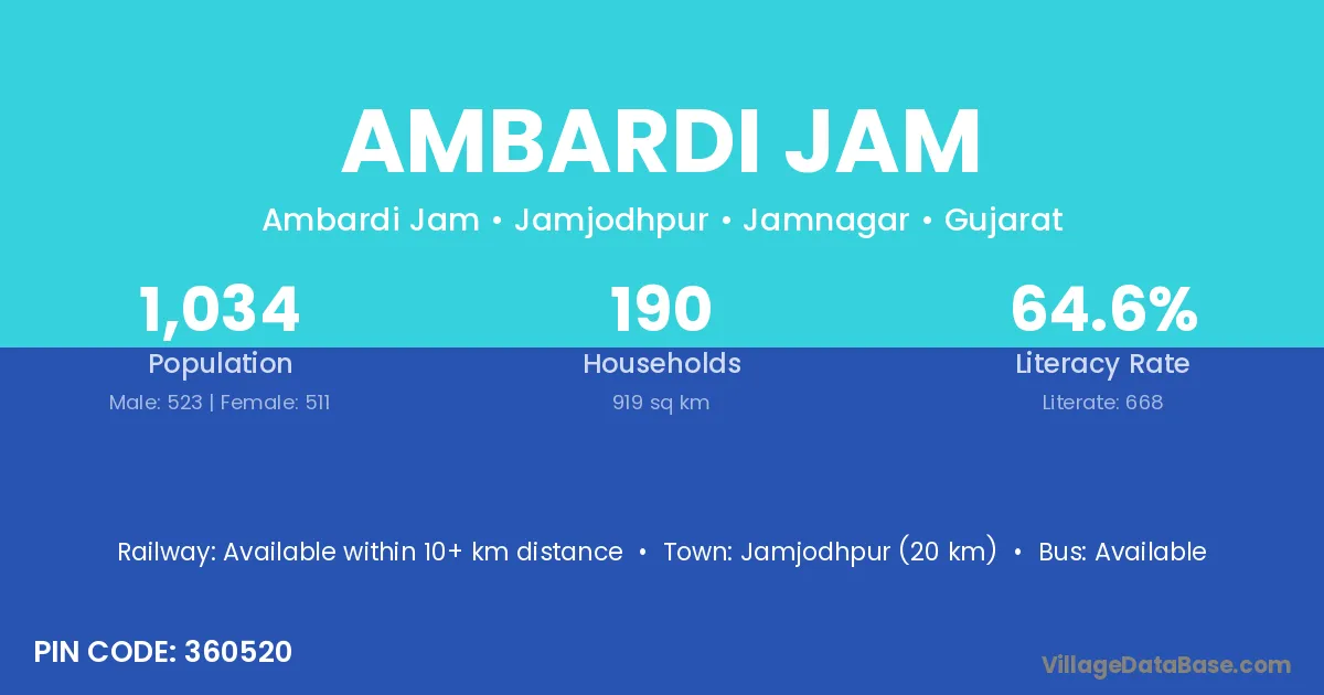 Jamjodhpur (20 km) is the nearest town to Ambardi Jam village for major economic activities and is located approximately 20 km away.