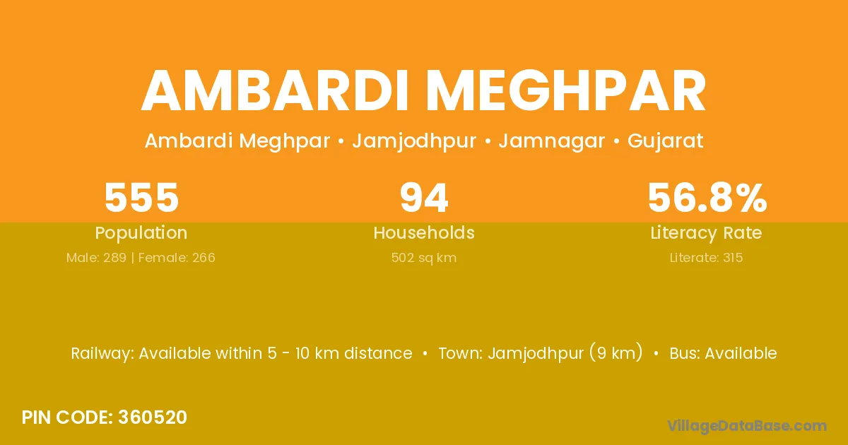 Jamjodhpur (9 km) is the nearest town to Ambardi Meghpar village for major economic activities and is located approximately 9 km away.