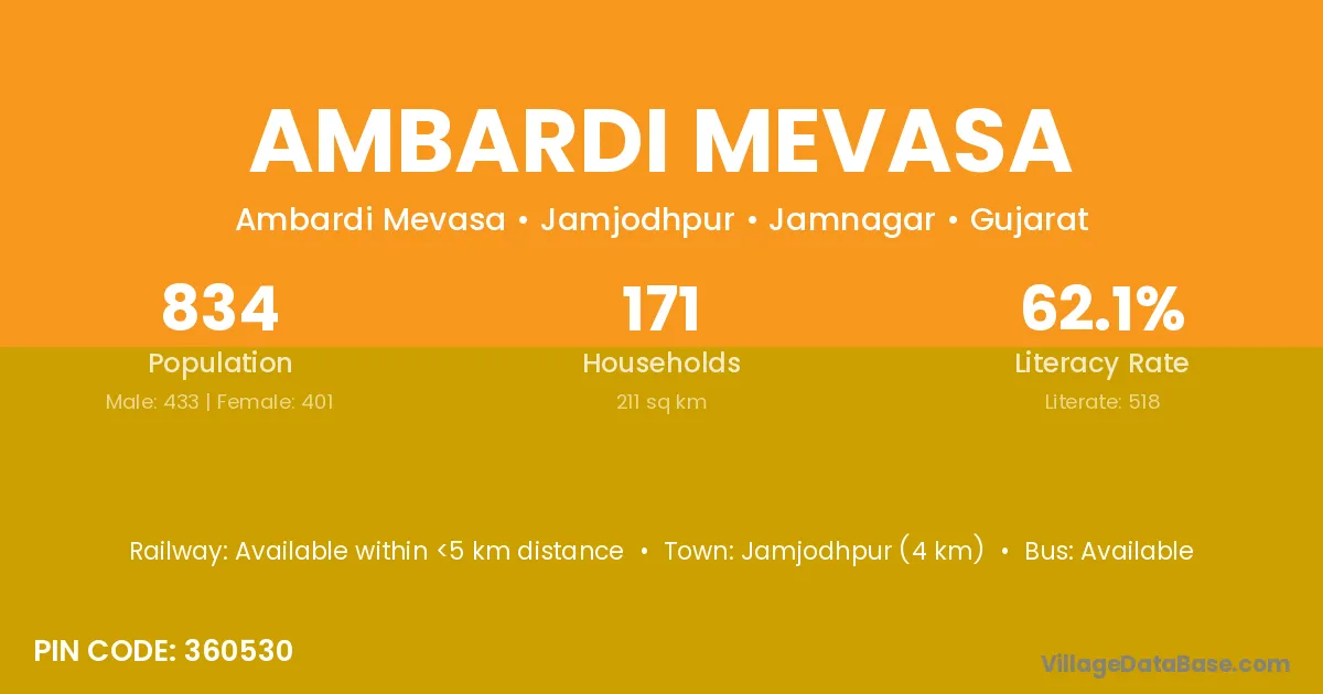 Jamjodhpur (4 km) is the nearest town to Ambardi Mevasa village for major economic activities and is located approximately 4 km away.
