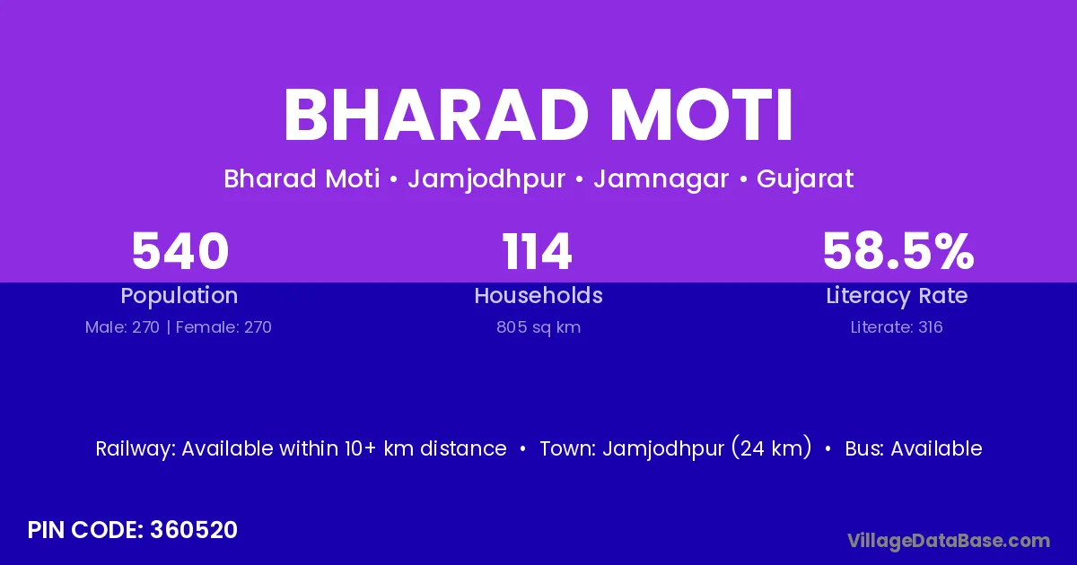 Jamjodhpur (24 km) is the nearest town to Bharad Moti village for major economic activities and is located approximately 24 km away.
