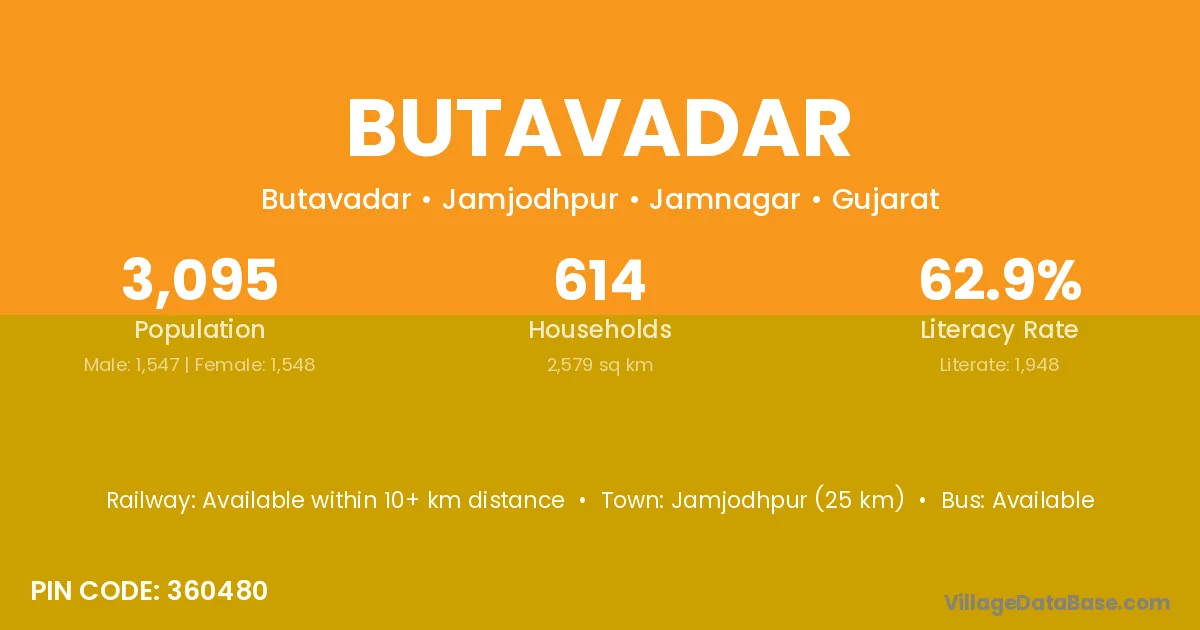 Jamjodhpur (25 km) is the nearest town to Butavadar village for major economic activities and is located approximately 25 km away.