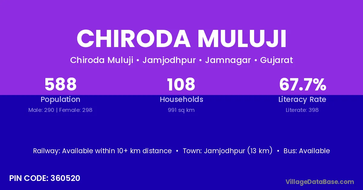Jamjodhpur (13 km) is the nearest town to Chiroda Muluji village for major economic activities and is located approximately 13 km away.