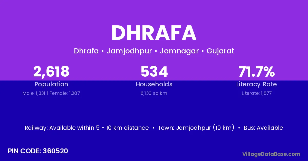 Jamjodhpur (10 km) is the nearest town to Dhrafa village for major economic activities and is located approximately 10 km away.