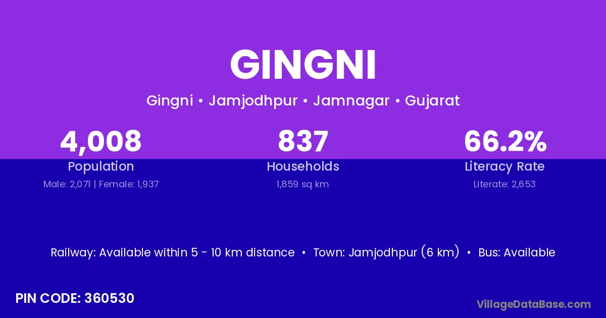 Jamjodhpur (6 km) is the nearest town to Gingni village for major economic activities and is located approximately 6 km away.