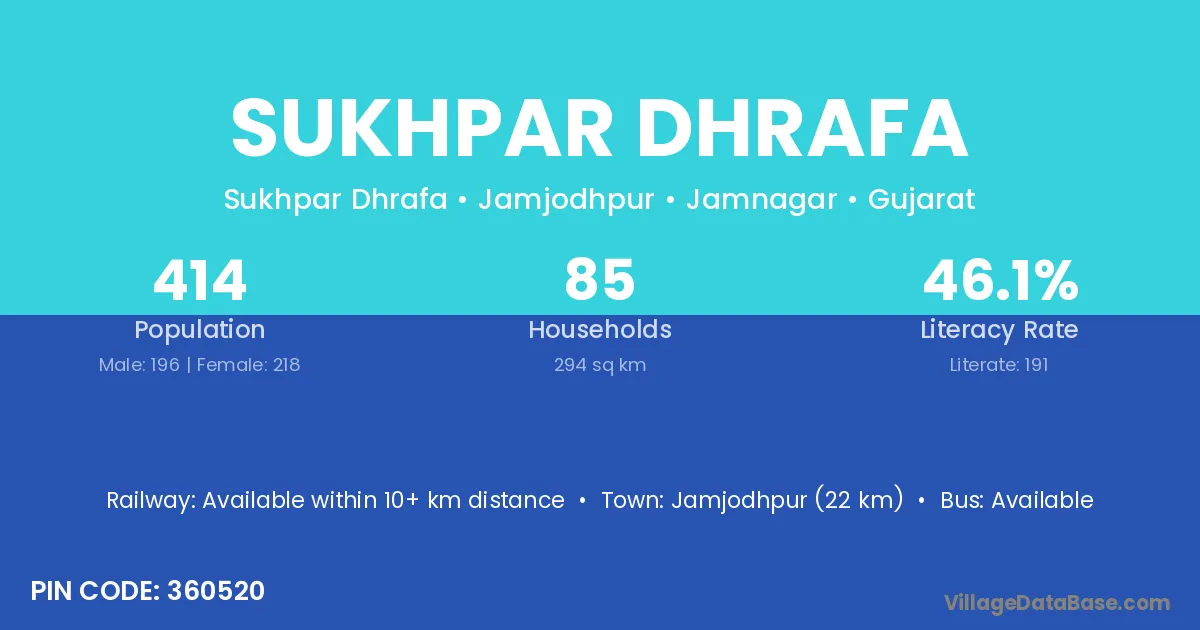 Jamjodhpur (22 km) is the nearest town to Sukhpar Dhrafa village for major economic activities and is located approximately 22 km away.