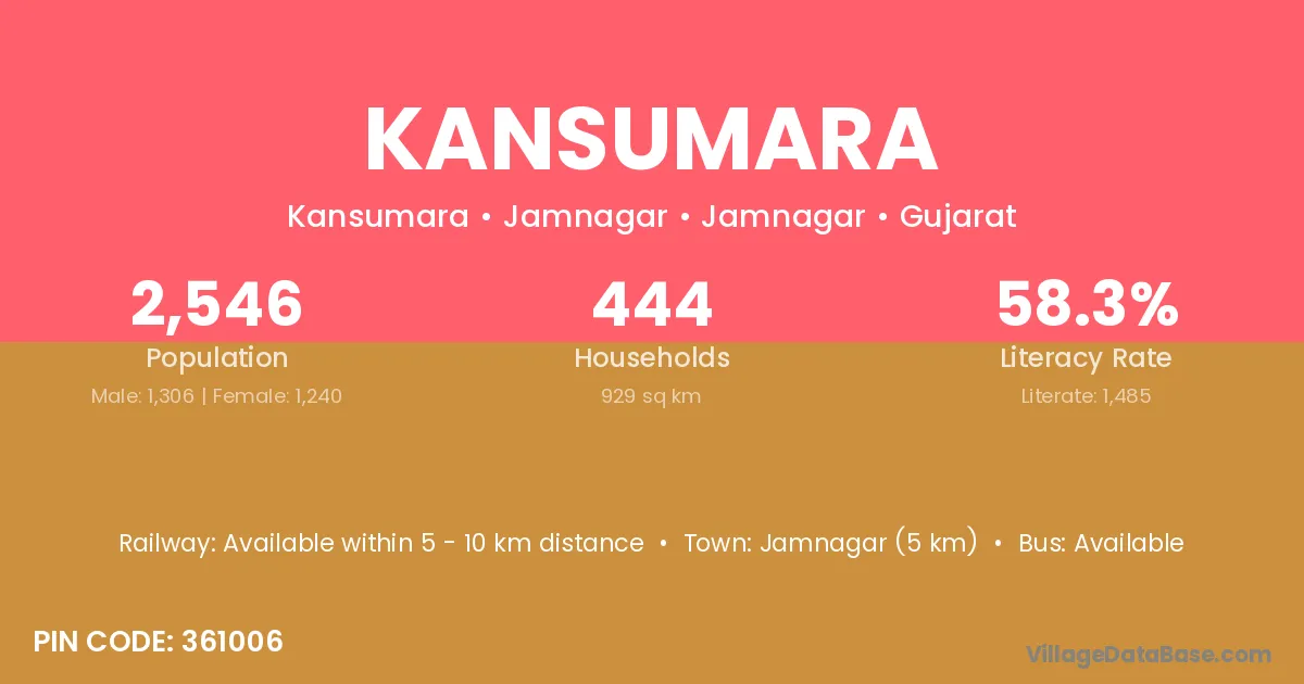 Jamnagar (5 km) is the nearest town to Kansumara village for major economic activities and is located approximately 5 km away.