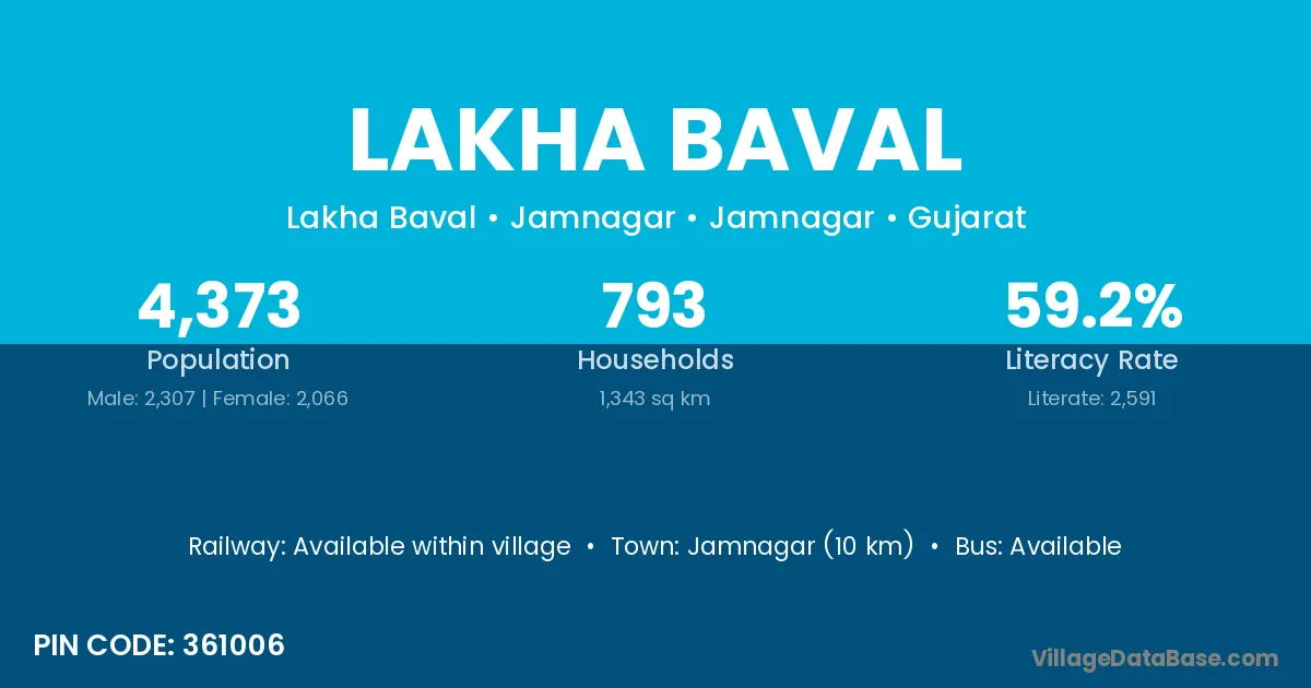 Jamnagar (10 km) is the nearest town to Lakha Baval village for major economic activities and is located approximately 10 km away.