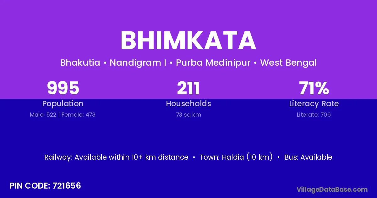 Morvi (42 km) is the nearest town to Bhimkata village for major economic activities and is located approximately 42 km away.