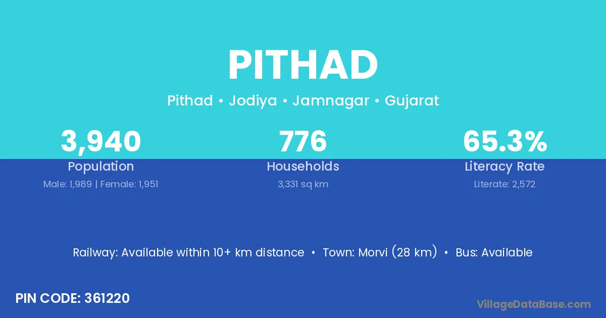Morvi (28 km) is the nearest town to Pithad village for major economic activities and is located approximately 28 km away.