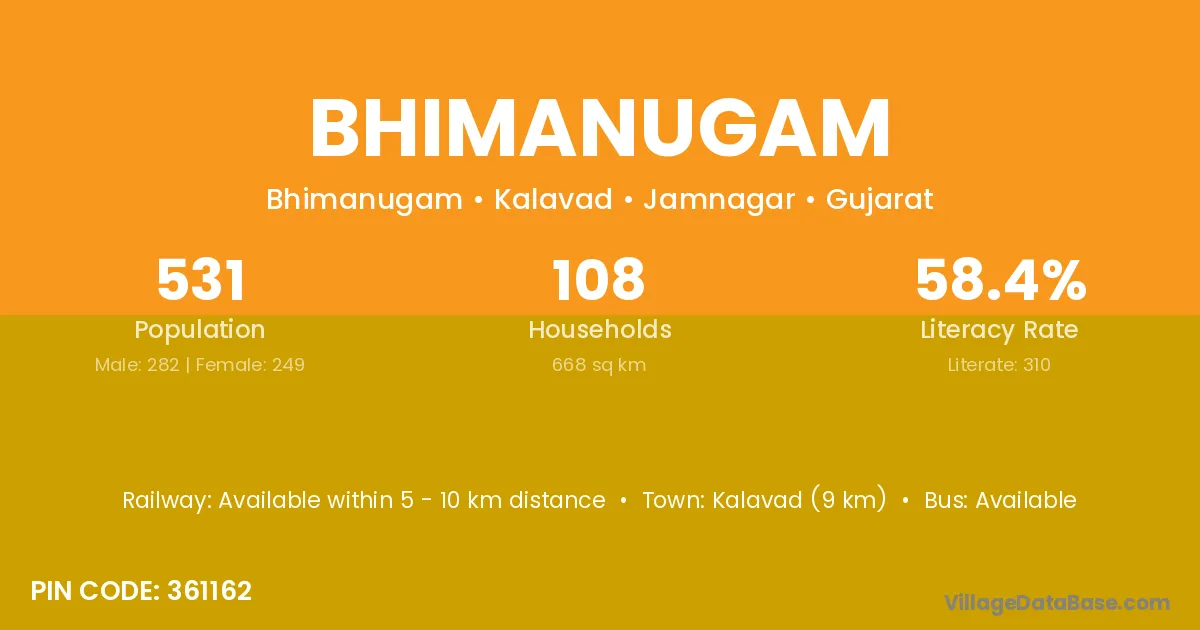 Kalavad (9 km) is the nearest town to Bhimanugam village for major economic activities and is located approximately 9 km away.
