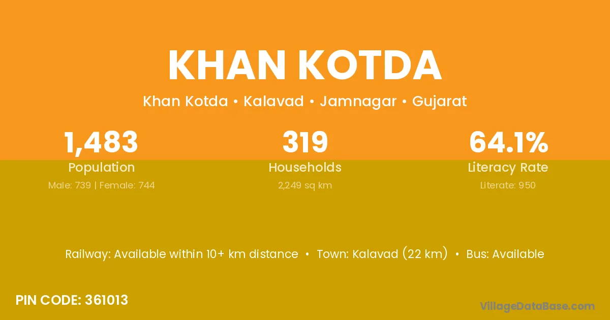 Kalavad (22 km) is the nearest town to Khan Kotda village for major economic activities and is located approximately 22 km away.
