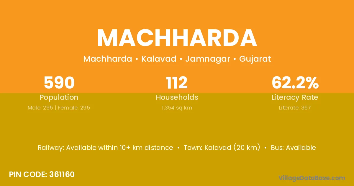 Kalavad (20 km) is the nearest town to Machharda village for major economic activities and is located approximately 20 km away.