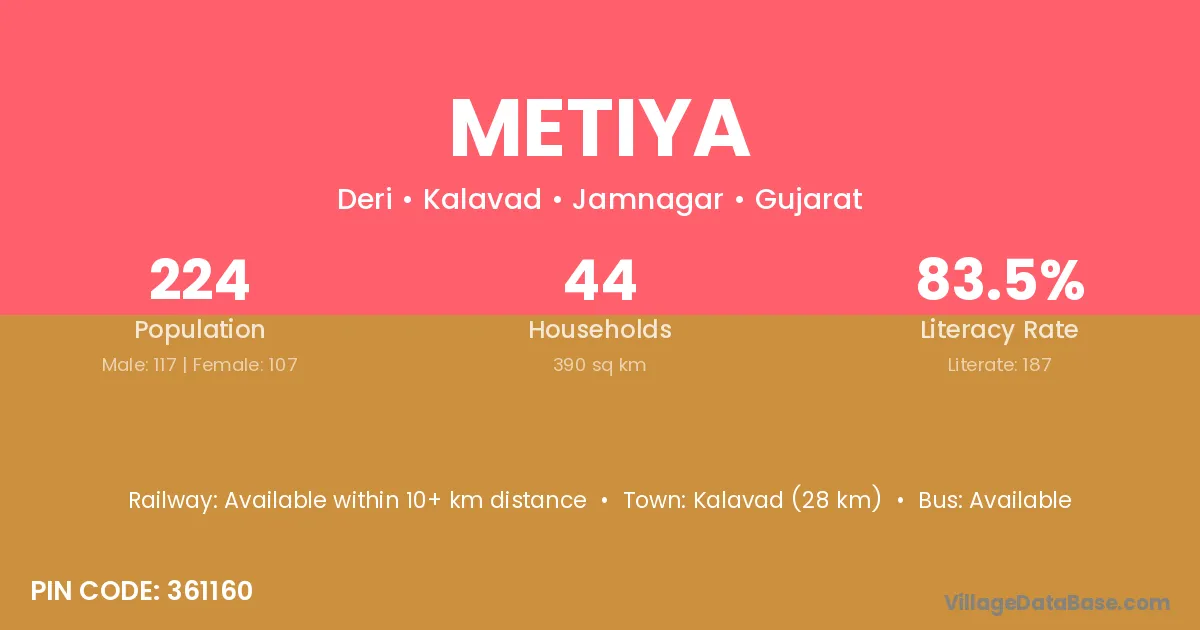 Kalavad (28 km) is the nearest town to Metiya village for major economic activities and is located approximately 28 km away.