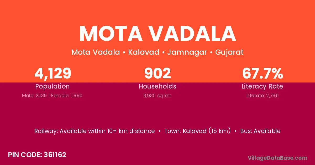 Kalavad (15 km) is the nearest town to Mota Vadala village for major economic activities and is located approximately 15 km away.