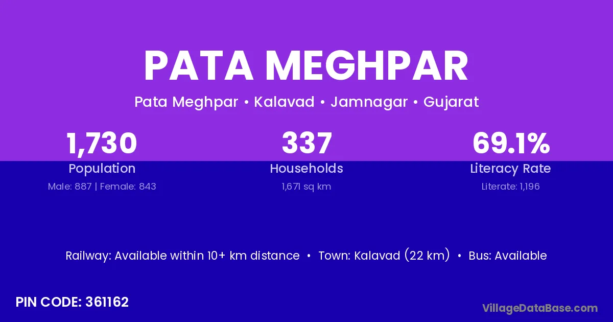 Kalavad (22 km) is the nearest town to Pata Meghpar village for major economic activities and is located approximately 22 km away.