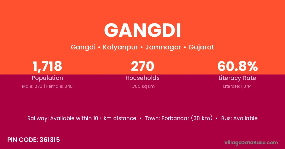 Porbandar (38 km) is the nearest town to Gangdi village for major economic activities and is located approximately 38 km away.