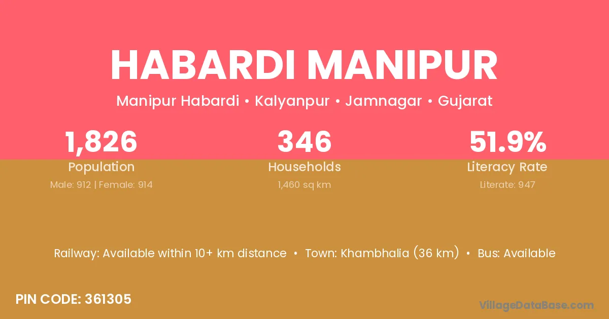 Khambhalia (36 km) is the nearest town to Habardi Manipur village for major economic activities and is located approximately 36 km away.