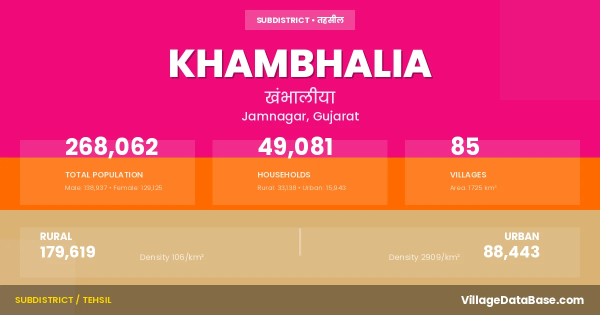 According to the 2011 census The total area of Khambhalia Taluka is 1725 km², with a population of 268062 people. The population density is 155 inhabitants per square kilometre, and there are approximately 49081 houses in the sub district.