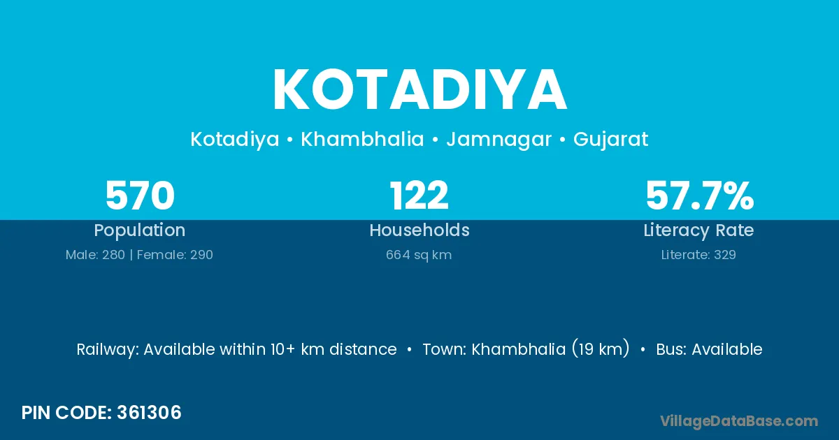 Khambhalia (19 km) is the nearest town to Kotadiya village for major economic activities and is located approximately 19 km away.
