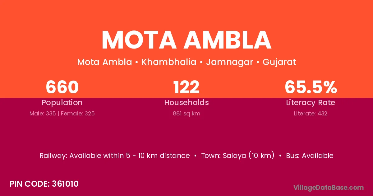 Salaya (10 km) is the nearest town to Mota Ambla village for major economic activities and is located approximately 10 km away.