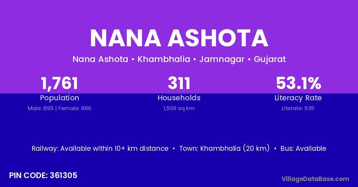 Khambhalia (20 km) is the nearest town to Nana Ashota village for major economic activities and is located approximately 20 km away.