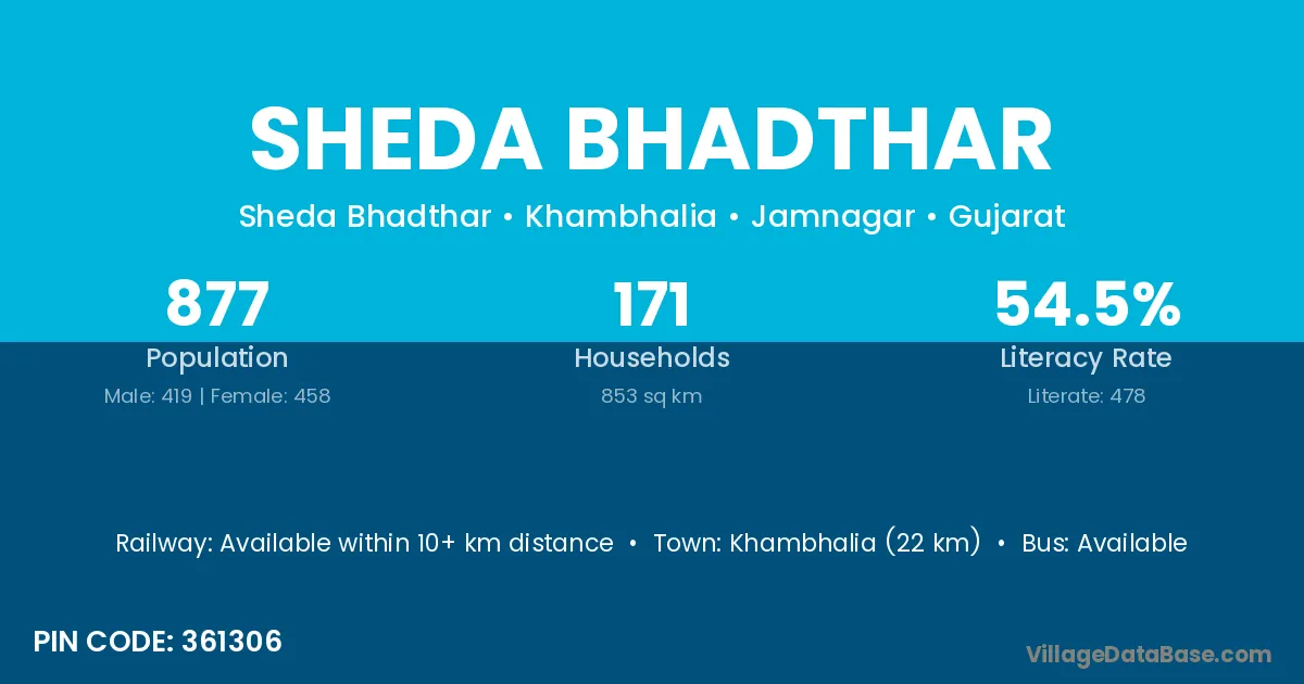 Khambhalia (22 km) is the nearest town to Sheda Bhadthar village for major economic activities and is located approximately 22 km away.