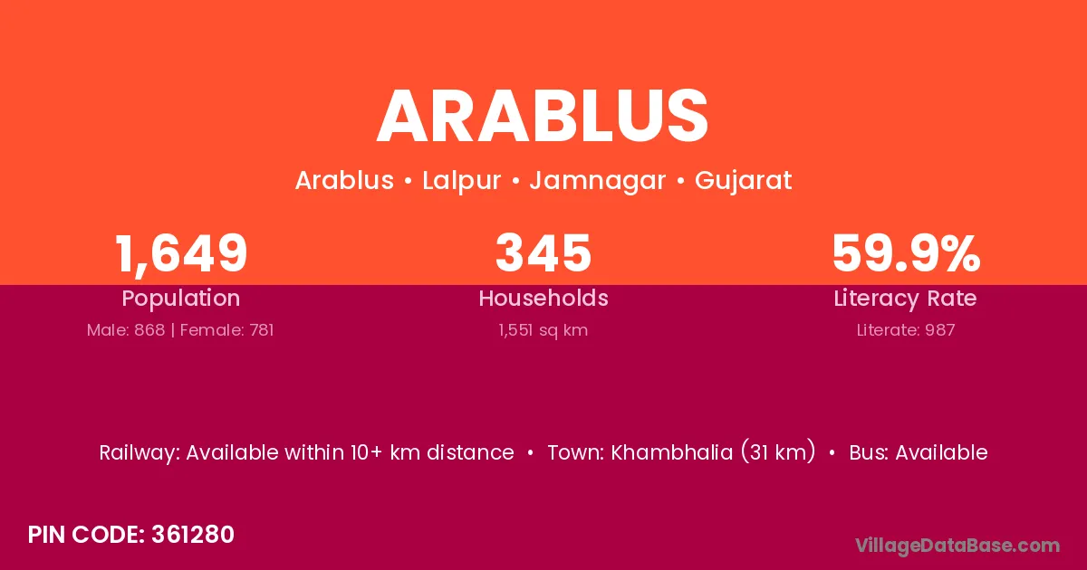 Khambhalia (31 km) is the nearest town to Arablus village for major economic activities and is located approximately 31 km away.