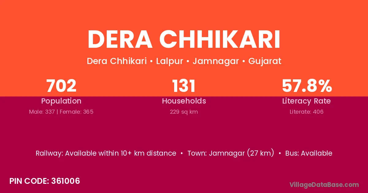 Jamnagar (27 km) is the nearest town to Dera Chhikari village for major economic activities and is located approximately 27 km away.