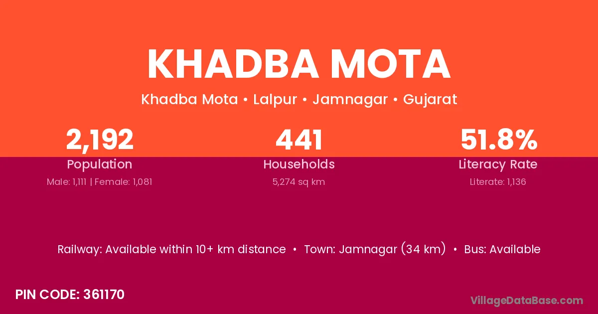 Jamnagar (34 km) is the nearest town to Khadba Mota village for major economic activities and is located approximately 34 km away.