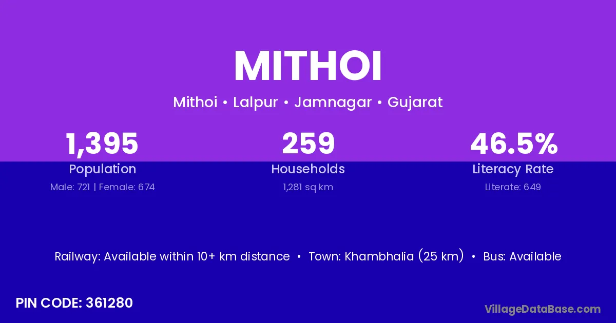 Khambhalia (25 km) is the nearest town to Mithoi village for major economic activities and is located approximately 25 km away.