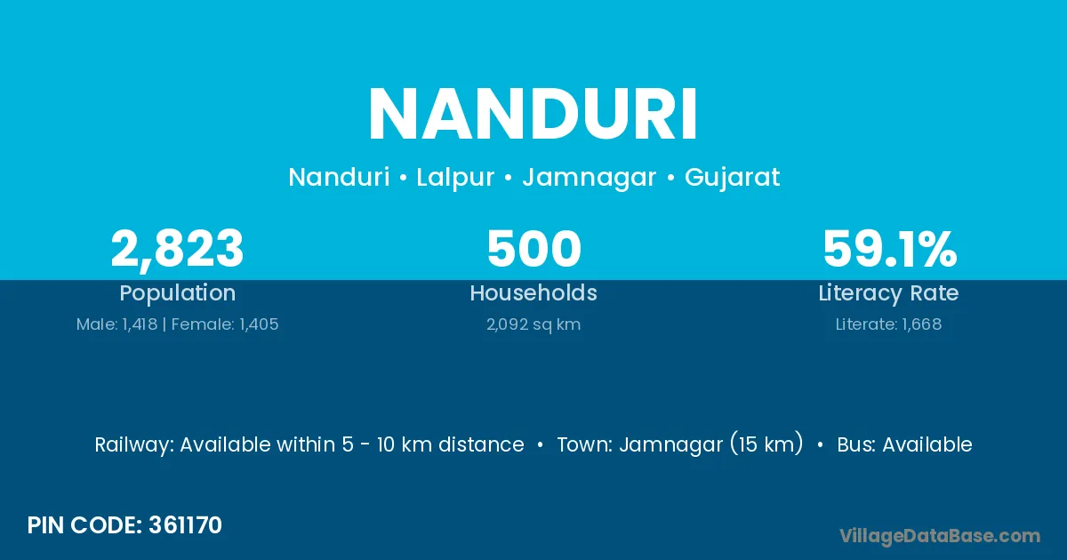 Jamnagar (15 km) is the nearest town to Nanduri village for major economic activities and is located approximately 15 km away.