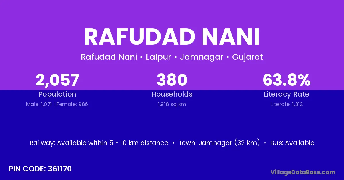 Jamnagar (32 km) is the nearest town to Rafudad Nani village for major economic activities and is located approximately 32 km away.