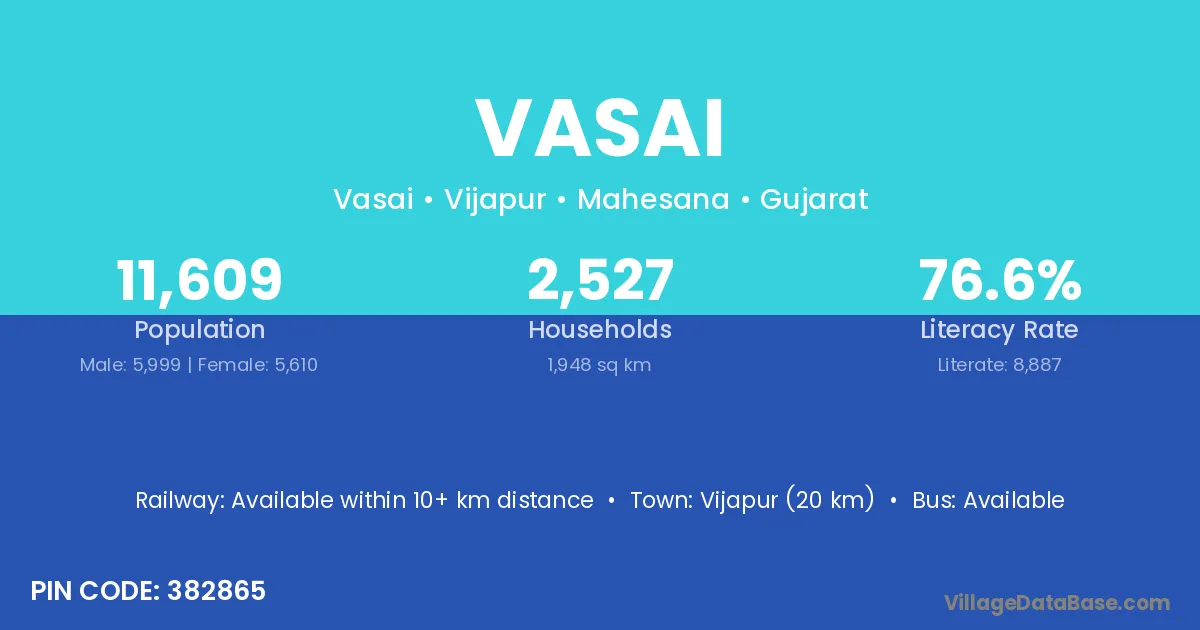 Dwarka (8 km) is the nearest town to Vasai village for major economic activities and is located approximately 8 km away.