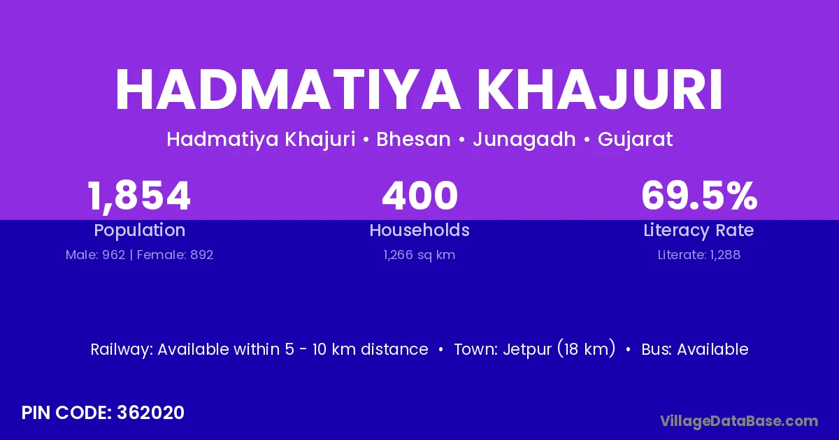 Jetpur (18 km) is the nearest town to Hadmatiya Khajuri village for major economic activities and is located approximately 18 km away.