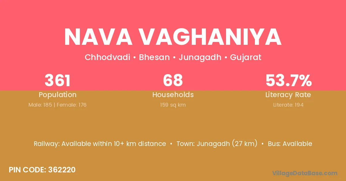 Junagadh (27 km) is the nearest town to Nava Vaghaniya village for major economic activities and is located approximately 27 km away.