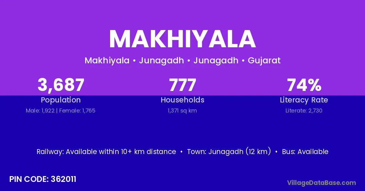 Junagadh (12 km) is the nearest town to Makhiyala village for major economic activities and is located approximately 12 km away.