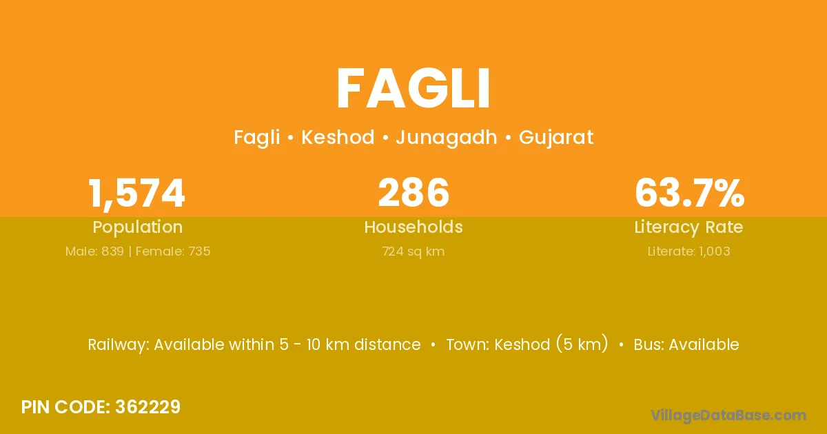 Keshod (5 km) is the nearest town to Fagli village for major economic activities and is located approximately 5 km away.