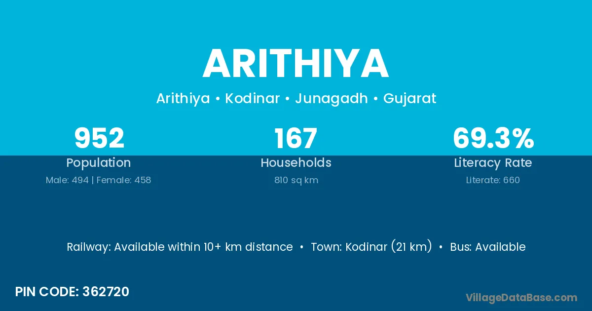 Kodinar (21 km) is the nearest town to Arithiya village for major economic activities and is located approximately 21 km away.