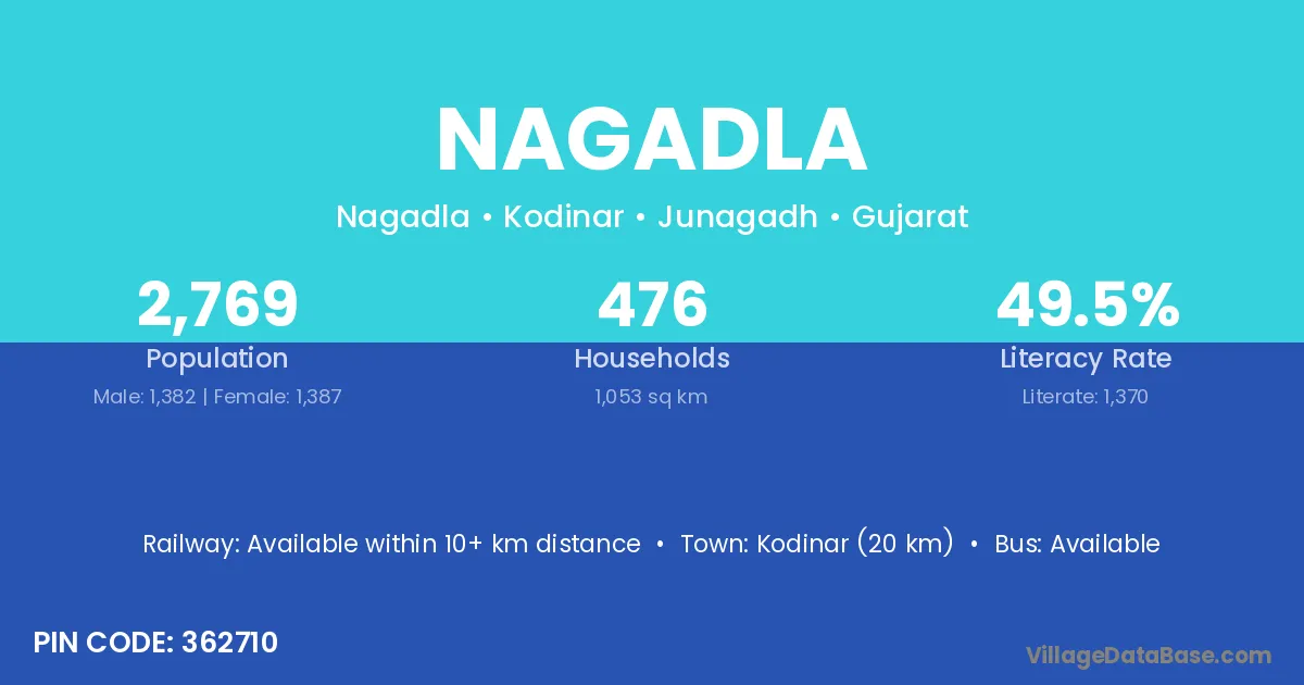 Kodinar (20 km) is the nearest town to Nagadla village for major economic activities and is located approximately 20 km away.