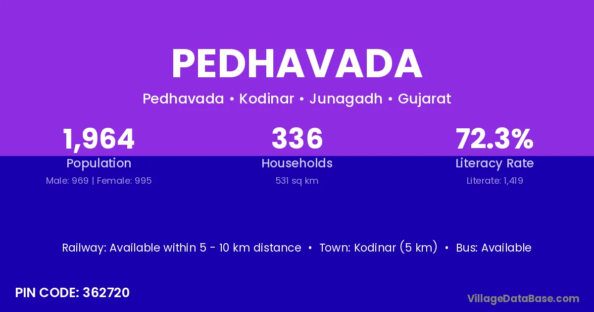 Kodinar (5 km) is the nearest town to Pedhavada village for major economic activities and is located approximately 5 km away.