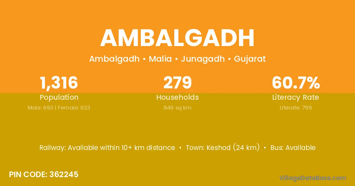 Keshod (24 km) is the nearest town to Ambalgadh village for major economic activities and is located approximately 24 km away.