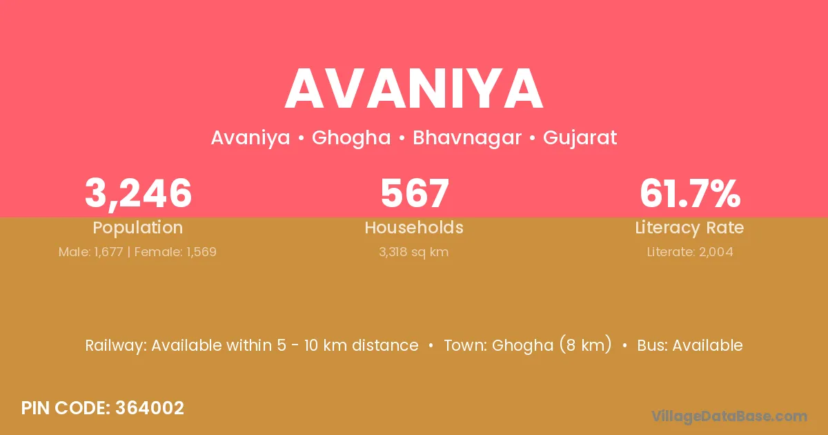 Keshod (20 km) is the nearest town to Avaniya village for major economic activities and is located approximately 20 km away.