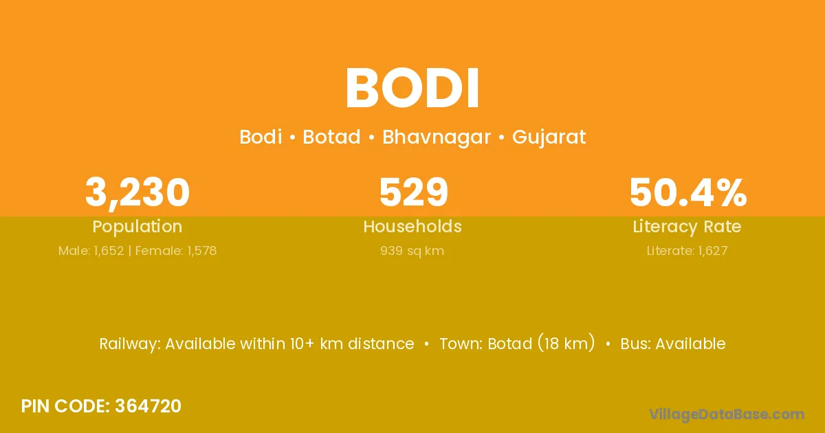 Keshod (21 km) is the nearest town to Bodi village for major economic activities and is located approximately 21 km away.