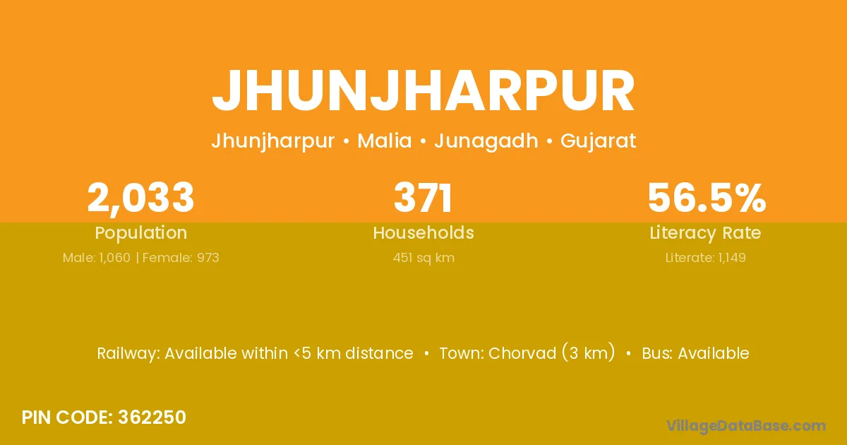 Chorvad (3 km) is the nearest town to Jhunjharpur village for major economic activities and is located approximately 3 km away.